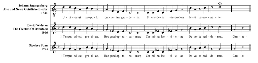 Dit is ongetwijfeld de meest bekende versie. Wulstan gebruikte een andere melodie dan Woodward had voorgesteld, en vergat te vermelden wat, waarom en hoe. Pas later werd duidelijk dat hij wel degelijk echt musicologisch speurwerk had gedaan. De melodie die hij liet zingen stond namelijk genoteerd in een Praags handschrift bij een lied, waarvan het eerste couplet gelijk was aan het derde van Gaudete. (het couplet over de poort van Ezechiel, zie onder). Een aardig détail is dat de Britse Folk-rock group Steeleye Span, toen zij het lied ook wilden proberen, natuurlijk grepen naar Wulstan’s versie, maar het begin en het eind hen blijkbaar niet goed beviel (of lag) en het hebben aangepast.