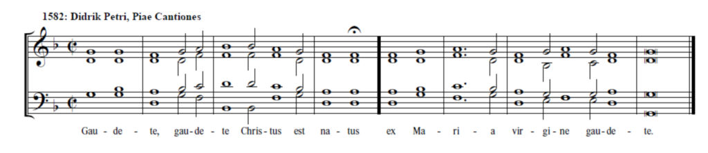 Minder bekend is dat de tekst en melodie van dit lied (m.n. van de 4 coupletten) de 20ste eeuwse uitvoerders voor een probleem plaatsen, want in de oudste bekende druk (1582, Piae Cantiones) staan mooi de vier stemmen van het refrein genoteerd, maar bij de vier coupletten staan geen muzieknoten:
