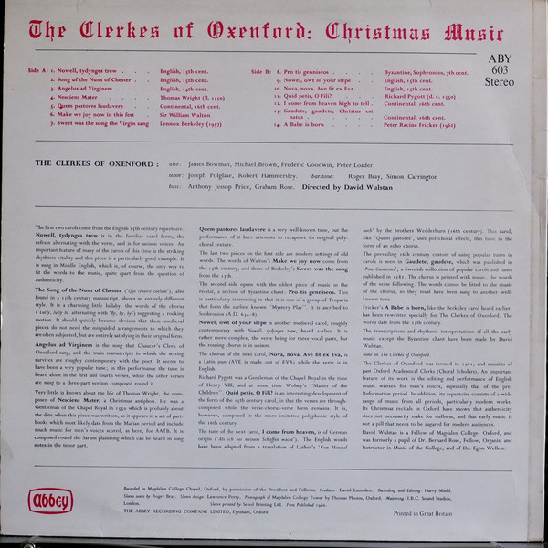 Zijn bedoeling was dat ze gezongen zouden worden (in kerk en school), dus moest hij ook een melodie voorzien voor de coupletten. Hij doet een voorstel (de melodie van Good king Wenceslas, trouwens) maar dat wordt geen succes. De doorbraak van dit lied komt er als de Clerkes of Oxenford (o.l.v. David Wulstan) in 1966 een KerstLP uitbrengen met o.a. die lied (kant B, nr. 6).