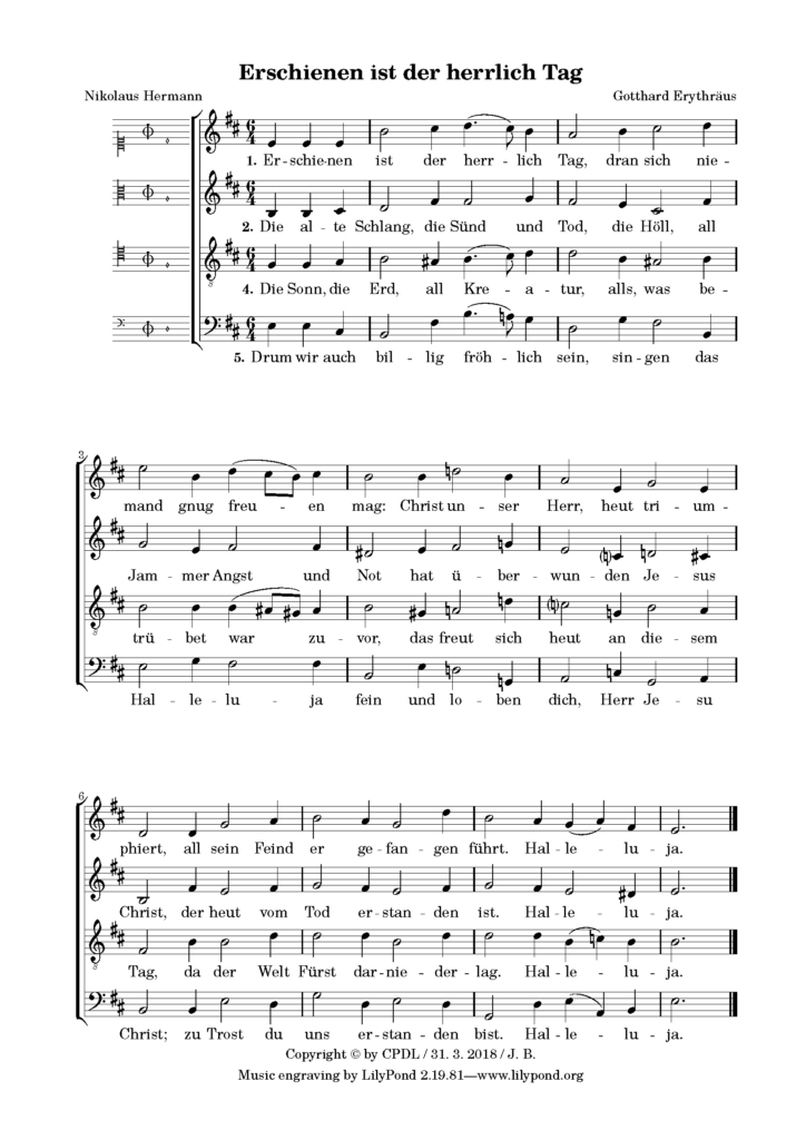 1) Erschienen ist der herrlich Tag, dran sich niemand gnug freuen mag; Christ, unser Herr, heut triumphiert, all seine Feind gefangen führt. Halleluja!