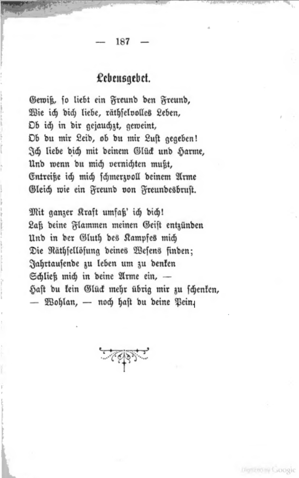 De ‘vol ingeworpen inhoud’ in de tweede regel is wel heel bot, zeker vergeleken met het tedere ‘sluit me in de armen’. Ze voegt droogjes toe: Nachdem ich es Nietzsche gelegentlich aus dem Gedächtnis niedergeschrieben und er es darauf in Musik gesetzt hat, lief es feierlicher auf etwas verlängerten Versfüßen. Hier het originele gedicht (met kortere versvoet, d.w.z. de regels met vrouwelijk rijm blijven jambisch):