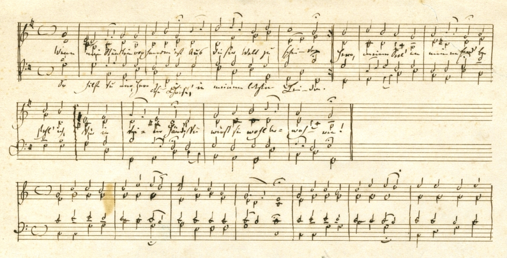 Het oorspronkelijke handschrift van de twee koraalzettingen kwam in 1938 uit de nalatenschap van Robert Schumanns jongste dochter Eugenie in het Robert‑Schumann‑Haus te Zwickau. Het autograaf was daar een van de kostbaarste tentoonstellingsobjecten en werd — partieel — ook wel als illustratie in boeken gebruikt.7 Het betreft een blad met notenbalken in zestien systemen, waarvan slechts de bovenste zes zijn beschreven. In het zevende en achtste systeem zijn wel sleutels aangebracht, maar geen noten meer genoteerd.