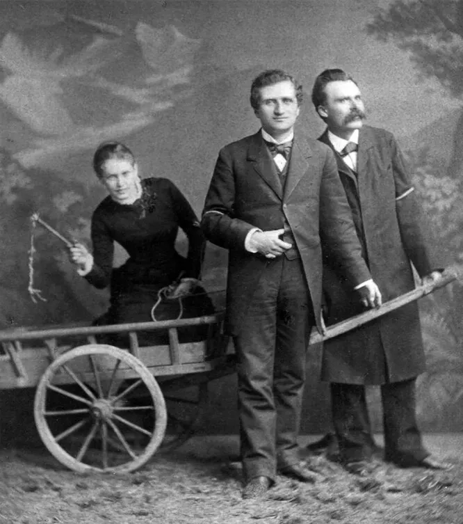 Lou laat er geen twijfel over bestaan dat die foto volledig het initiatief is van Nietzsche, die zich persoonlijk en ijverig met alles, zelfs kleinigheden als de strikjes aan het zweepje, bezighield. Rée stribbelde heftig tegen en vond het afschuwelijk; Lou vond het kitsch.