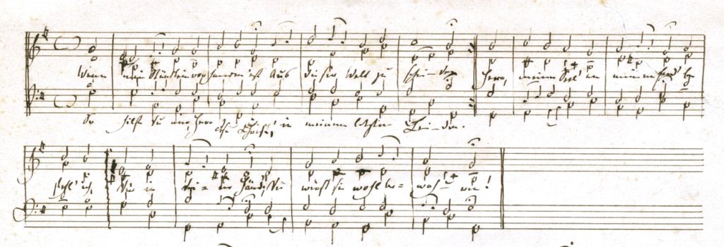 - En als je op sterven ligt (want de kinderen werden niet oud, nemen de liederen mee naar huis): “Wenn mein Stündlein vorhanden ist” (gezang 270). Het laatste couplet is ook vaak apart geciteerd en op muziek gezet (“Weil du vom Tod erstanden bist…” – Schütz musicalische exequien). Het koraal is nog getoonzet door Schumann, in z’n laatste levensjaar, toen hij opgenomen was in de kliniek. De laatste maand was hij bezig met de bijbel en het liedboek. Meer info: klik hier