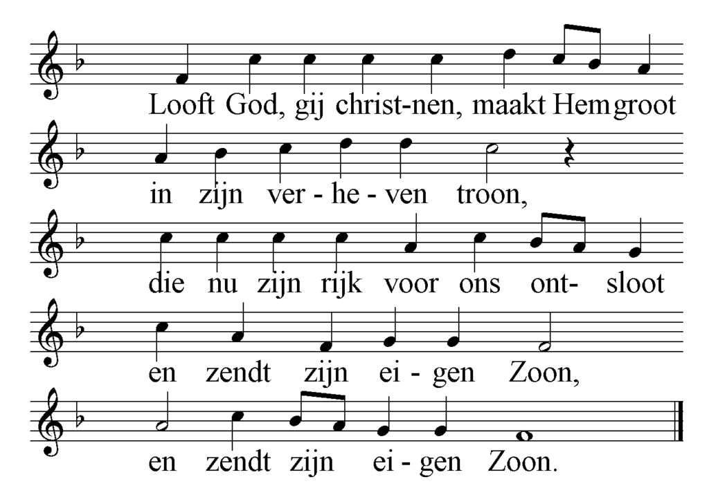 Hoe eenvoudig dit lied ook is, toch is het een en al Heilige Schrift wat u hoort (met een Luther’s accent, m.n. in 6 en 7: ‘De vrolijke ruil’). De ‘incarnatie’, daar gaat het om, maar dan niet abstract-theoretisch, speculatief, maar concreet: God wordt mens, en niet een beetje, halfslachtig, neen: ècht, waarachtig mens. En daar mag je God wel voor danken, want alleen zo komen die twee bij elkaar : Looft God, gij christenen…