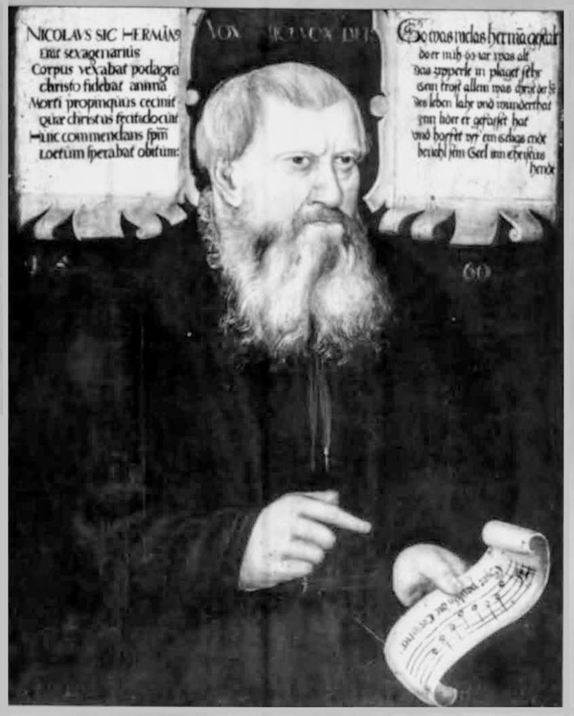 Nog iets over de dichter-componist : Nicolaus (of Niclas) Herman (1500-1561). We weten weinig private dingen over deze man, behalve dat hij in de buurt van Nürnberg geboren is, en dat hij op 18 jarige leeftijd in St-Joachimstal is, en wel als leraar aan de Latijnse school. Op zich niet zo bijzonder, ware het niet dat hij dat z’n hele leven zou blijven èn Joachimstal toen nog maar 2 jaar bestond. in 1516 was een rijke zilverader ontdekt in het dal (Thal), en de ontginning was meteen aangevat. Het daarrond ontstane mijnwerkersdorp (industriestadje) werd toegewijd aan St. Joachim. Het was het Klondike van de 16de eeuw.