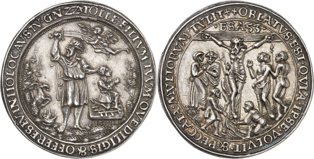 Links het (bijna)offer van Isaac door zijn vader, rechts het voltrokken offer van Christus door zijn Vader. Een van die — eigenlijk nogal schokkende — standaard christelijke typologieën. Op deze pagina – tevens de bron – vindt u meer uitleg en voorbeelden (English)