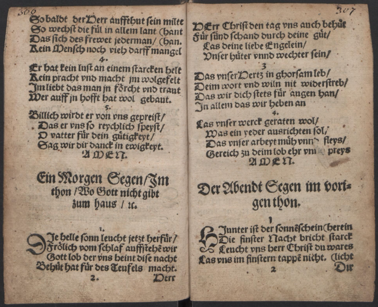 - En ‘s ochtends en s’avonds: “Die helle Sonn leucht’ jetzt herfür” (gezang 373), “Hinunter ist der Sonnen Schein” (384)en “Ach bleib bei uns, Herr Jesu Christ” (gezang 316).